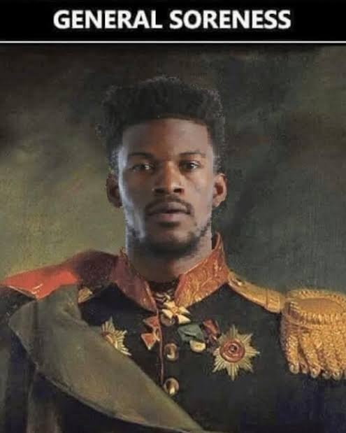 巴特勒晒的这张图带有一语双关的意思,明面是一位将军名字叫Soreness,但这两个单词可以翻译成“全身酸痛”,放在NBA伤病报告里,基本意思是球员只是身体疲劳、有点不舒服,但没有明确受伤部位。经常被用来给老将轮休、背靠背休息或负荷管理找个官方理由,所以球迷一看见就会自动理解成“没大事,就是不让打”。