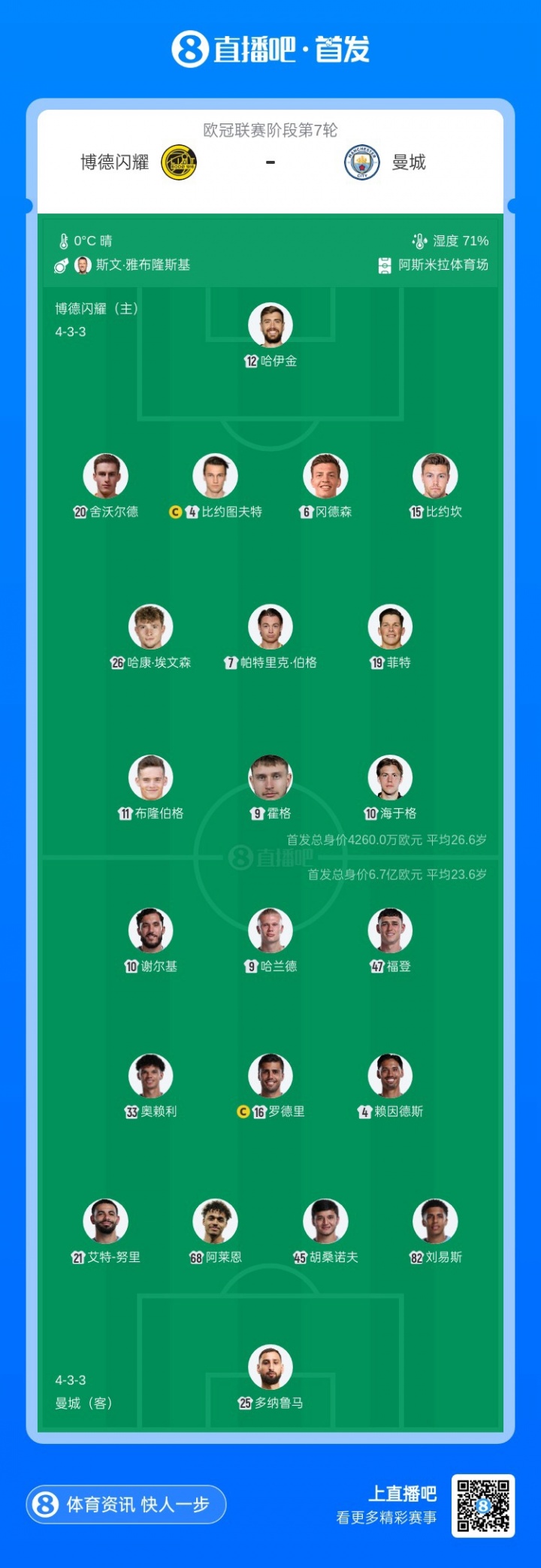 1月21日讯 欧冠联赛阶段第7轮,曼城客战博德闪耀,赛前首发公布。